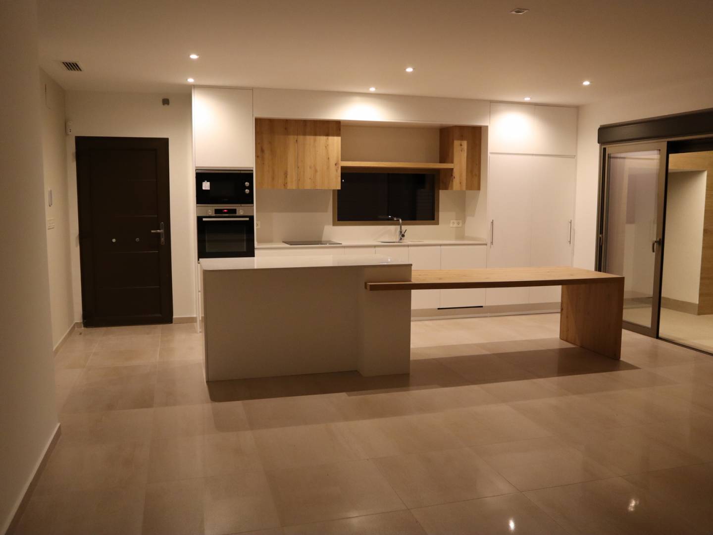 El interior de la vivienda está diseñado con un enfoque en la comodidad y la eficiencia. Los suelos de gres porcelánico aportan un toque de elegancia y son fáciles de mantener. La cocina está equipada con electrodomésticos modernos, facilitando las tareas diarias. El sistema de aire acondicionado garantiza un ambiente agradable durante todo el año. Las persianas eléctricas y los armarios empotrados son detalles que añaden funcionalidad y confort al hogar, permitiendo un uso óptimo del espacio.
