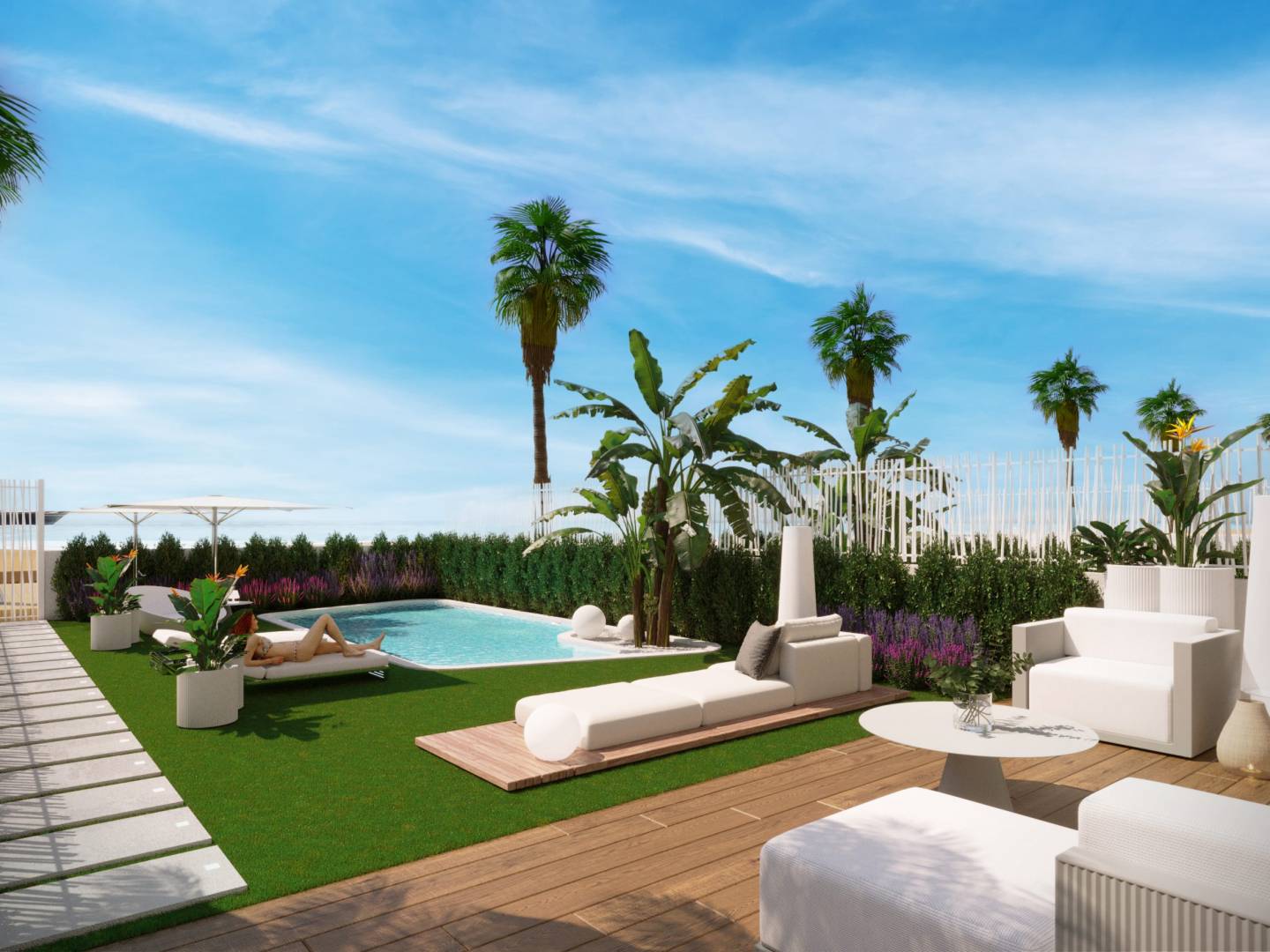Los exteriores de este residencial están diseñados para maximizar el disfrute del entorno natural. Cada propiedad cuenta con un jardín privado, ideal para relajarse al aire libre. Las terrazas amplias ofrecen un espacio adicional para disfrutar de las vistas al mar y del clima mediterráneo. Además, algunas tipologías incluyen un solárium, proporcionando un espacio exclusivo para tomar el sol o disfrutar de momentos de tranquilidad. La ubicación en primera línea de playa asegura que los residentes puedan disfrutar de la brisa marina y de vistas ininterrumpidas al horizonte.
