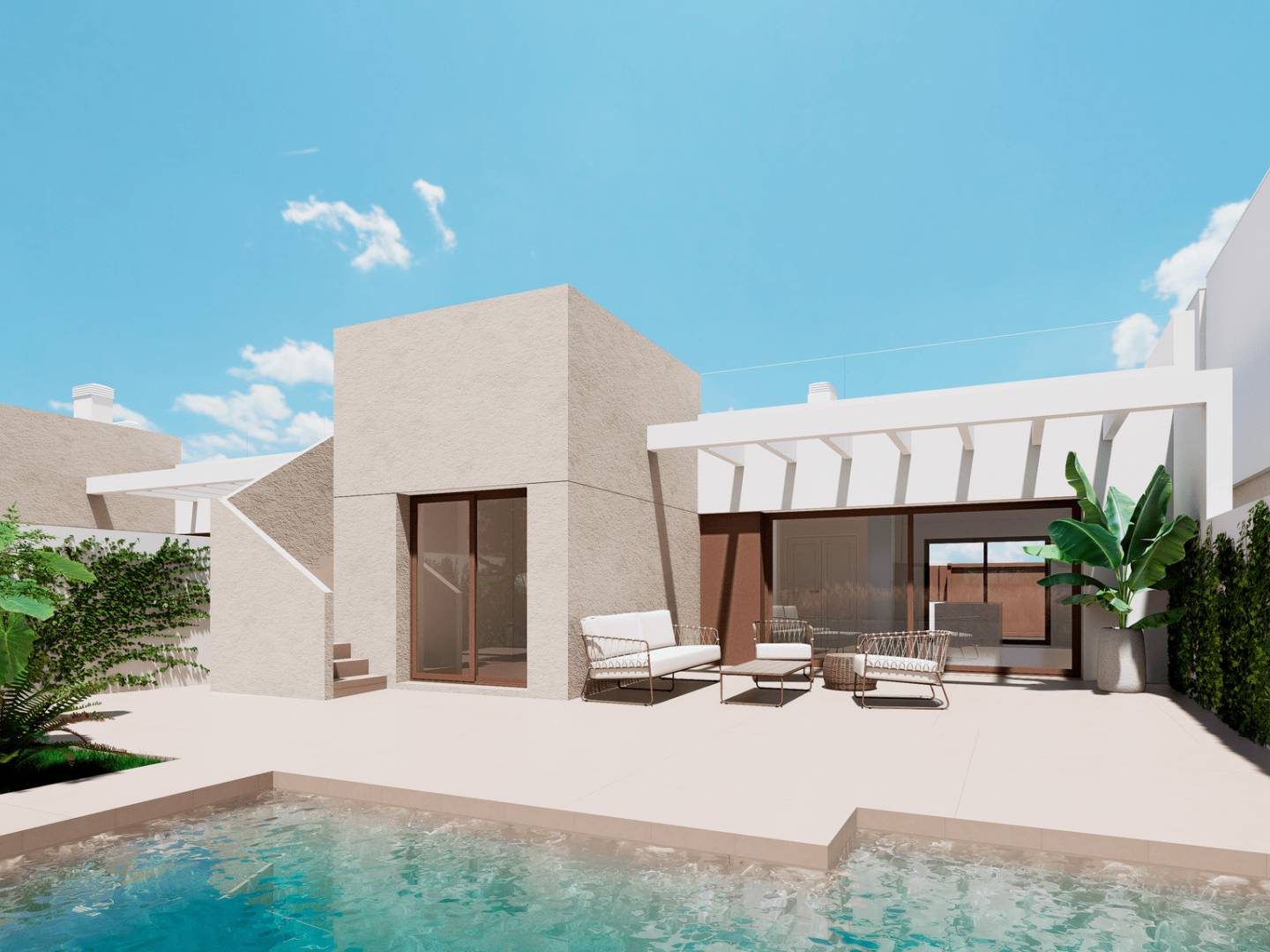 Los exteriores de estas propiedades han sido cuidadosamente diseñados para ofrecer un espacio de relajación y disfrute al aire libre. Cada vivienda cuenta con un jardín privado, ideal para crear un oasis personal o para disfrutar de momentos en familia. Las terrazas amplias permiten aprovechar al máximo el clima mediterráneo, ofreciendo un lugar perfecto para cenas al aire libre o simplemente para relajarse. Además, algunas propiedades disponen de un solárium, proporcionando un espacio adicional para tomar el sol o disfrutar de las vistas. La inclusión de una piscina privada en ciertas viviendas añade un toque de lujo y exclusividad, permitiendo refrescarse en la privacidad de su hogar.