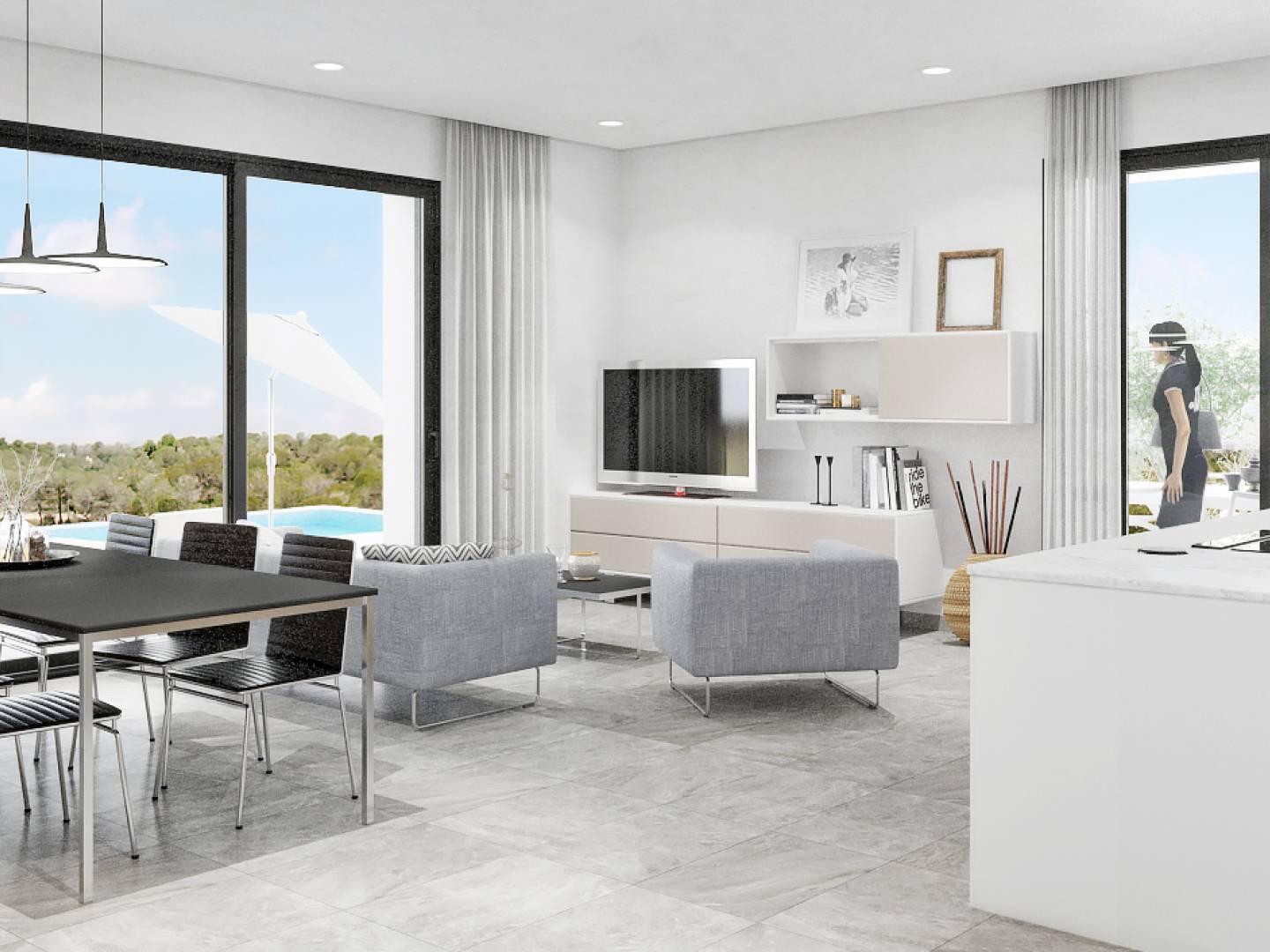 El interior de la villa está equipado con las más modernas comodidades para garantizar el máximo confort. Dispone de tres dormitorios y dos baños, lo que la hace perfecta para familias o para recibir invitados. Los suelos de gres porcelánico aportan un toque de elegancia y son fáciles de mantener. La villa está equipada con electrodomésticos de alta calidad, persianas eléctricas y un sistema de domótica que facilita el control de diversas funciones del hogar. Los armarios empotrados ofrecen un amplio espacio de almacenamiento, mientras que el videoportero proporciona seguridad adicional.
