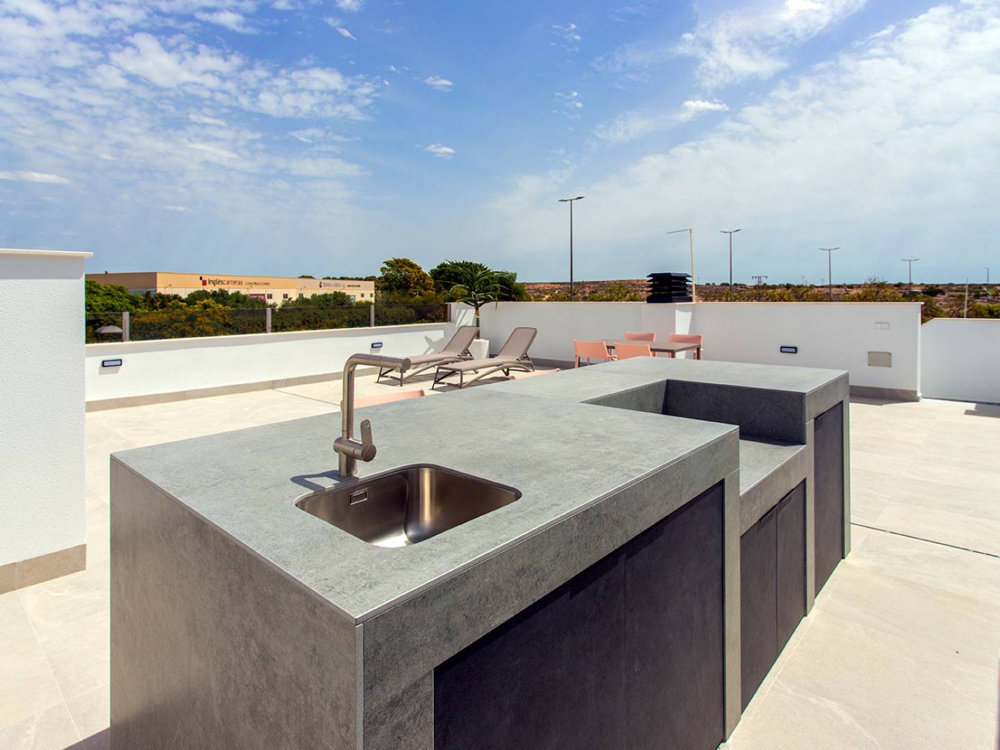 Los exteriores de estos adosados están pensados para ofrecer un espacio de relajación y disfrute al aire libre. Cada vivienda cuenta con un jardín privado, perfecto para disfrutar de momentos de ocio en familia o con amigos. La presencia de una piscina privada añade un toque de lujo y exclusividad, permitiendo refrescarse en los días calurosos sin salir de casa. Además, la terraza es un espacio ideal para disfrutar de las vistas y del clima mediterráneo, creando un ambiente acogedor y relajante. El solárium, por su parte, ofrece un espacio adicional para tomar el sol o simplemente disfrutar de las vistas panorámicas.