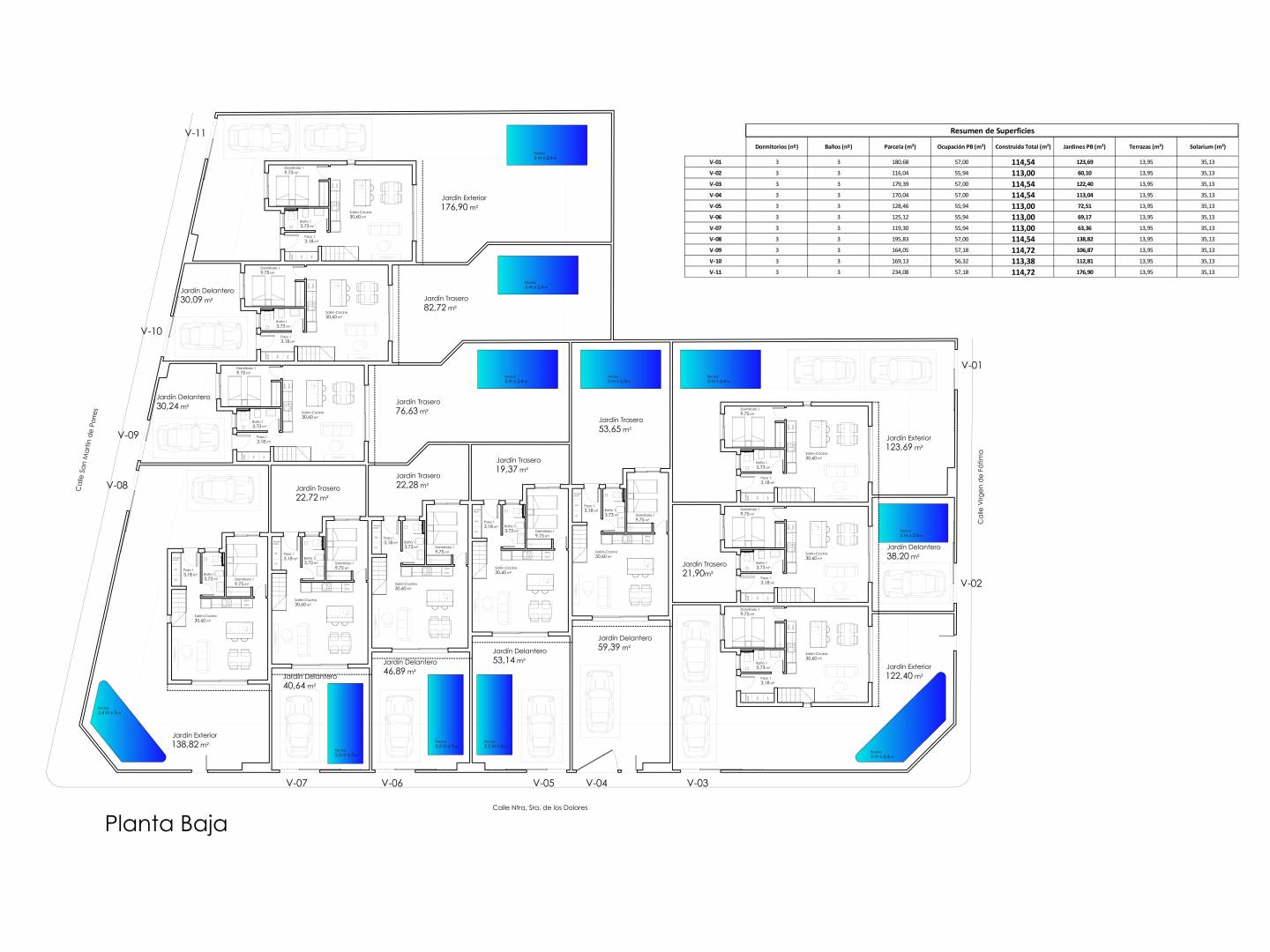 El interior de los adosados está diseñado para maximizar el confort y la funcionalidad. Cada vivienda cuenta con tres dormitorios y tres baños, ofreciendo un espacio adecuado para familias o quienes buscan un hogar con espacio adicional. La inclusión de un garaje asegura comodidad y seguridad para el estacionamiento de vehículos. Los espacios están pensados para ofrecer una experiencia de vida moderna y acogedora.