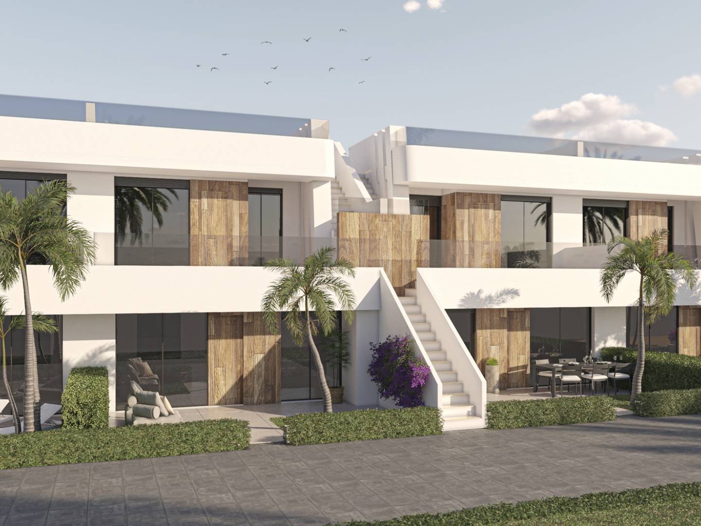 Las propiedades cuentan con espacios exteriores que invitan al relax y al disfrute del clima mediterráneo. Las plantas bajas disponen de jardines privados, ideales para crear un oasis personal al aire libre. Los áticos, por su parte, ofrecen solariums que permiten disfrutar de vistas panorámicas y del sol durante todo el día. Todas las propiedades incluyen terrazas, proporcionando un espacio adicional para el entretenimiento o simplemente para disfrutar de una cena al aire libre. Estos espacios exteriores están diseñados para complementar el estilo de vida relajado y al aire libre que caracteriza a la región.