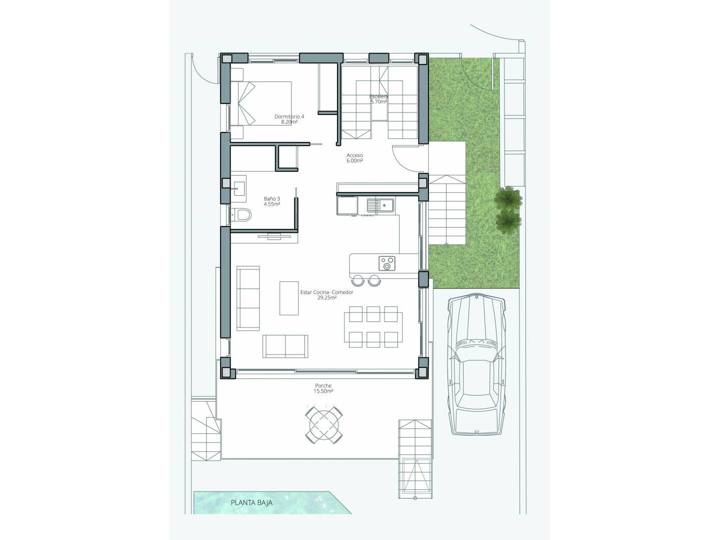 Los exteriores de estos adosados están pensados para maximizar el disfrute del clima mediterráneo. Cada propiedad cuenta con un jardín privado, perfecto para momentos de relajación o para disfrutar de actividades al aire libre. La presencia de una piscina privada añade un toque de lujo y exclusividad, permitiendo refrescarse en los días más cálidos. Además, las terrazas ofrecen un espacio adicional para disfrutar de las vistas al mar, convirtiéndose en el lugar ideal para cenas al aire libre o simplemente para contemplar el atardecer. El solárium es otro de los atractivos, proporcionando un espacio íntimo para tomar el sol o disfrutar de las vistas panorámicas.