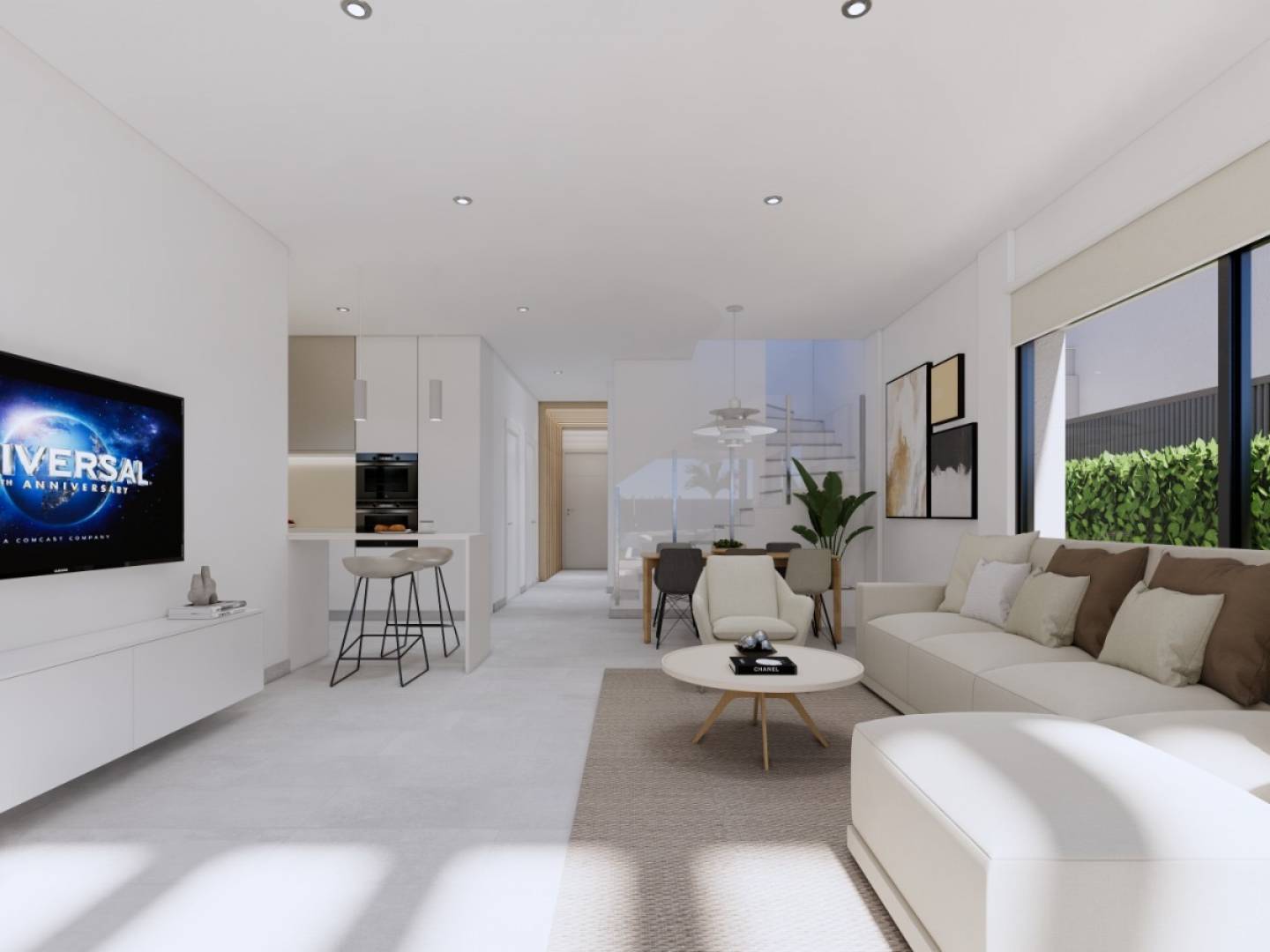 El interior de los adosados está cuidadosamente diseñado para ofrecer el máximo confort. Con una distribución que incluye 3 dormitorios y 3 baños, cada espacio está optimizado para la vida moderna. Los suelos de gres porcelánico aportan un toque de elegancia y durabilidad. Las propiedades están equipadas con aire acondicionado, persianas eléctricas y electrodomésticos, asegurando un ambiente cómodo y funcional. Los armarios empotrados ofrecen un almacenamiento eficiente, manteniendo los espacios ordenados y libres de desorden.