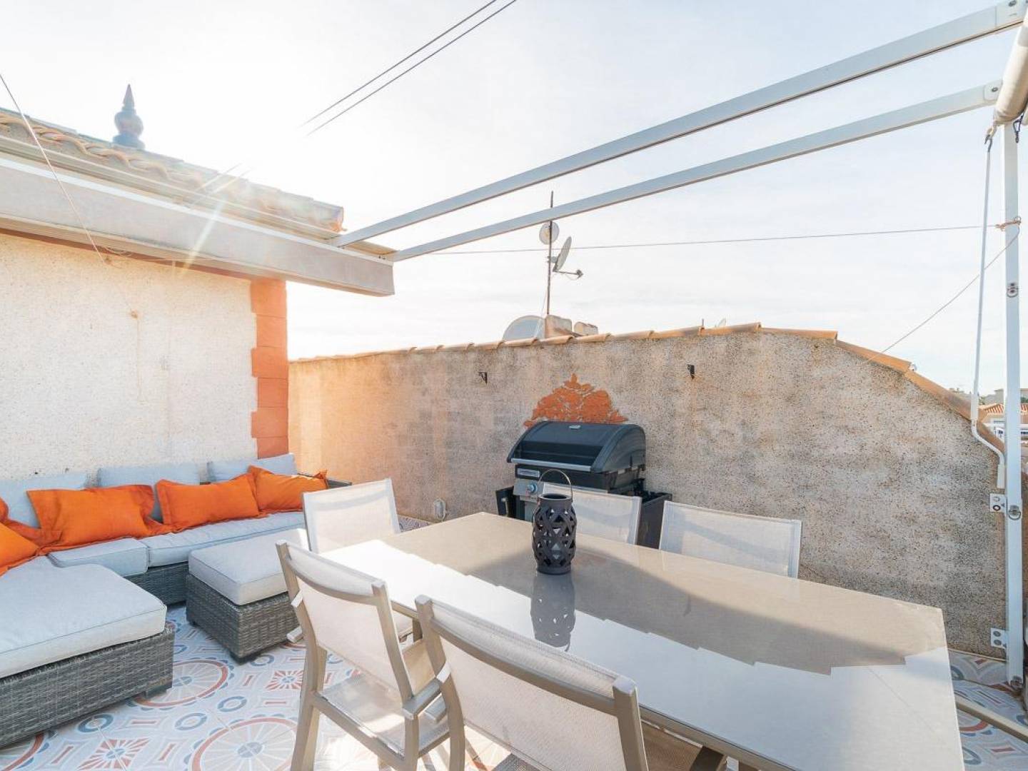 En la zona de Playa Flamenca Norte, muy cerca de la zona deportiva municipal de Orihuela Costa, con la piscina cubierta, las pistas de tenis, paddle, fútbol, baloncesto.... , a escasa distancia del centro comercial Zenia Boulevard, de zonas de ocio y compras, de las playas de Playa Flamenca y de múltiples posibilidades de ocio y diversión, se encuentra este complejo residencial cerrado con piscina comunitaria central, zona de parking interior dentro de la urbanización y muy tranquila y segura.~En esta zona tenemos a la venta una de las viviendas adosadas que miran hacia la piscina, con orientación Sur-Oeste, sol de mañana y medio día en el patio trasero y en la parte de atrás del solarium y con sol por la tarde en la parte frontal de la vivienda y el patio de entrada y la zona del solarium que tiene vistas hacia la piscina comunitaria. ~La vivienda cuenta con una terraza de entrada, un salón comedor muy luminoso, cocina independiente de buen tamaño y cocina amueblada y equipada con electrodomésticos que da paso a un patio trasero con zona de barbacoa, trastero, para bicicletas y acceso con puerta trasera, y, también tiene en planta baja un cuarto de aseo de uso para la planta principal, sin tener que subir a las plantas superiores al cuarto de baño principal.~En planta primera se encuentran los dos dormitorios, ambos de buen tamaño y con armarios empotrados y muchísima luz y el cuarto de baño principal, recien reformado, con ducha de obra y materiales de primera calidad con mueble de baño.~Y en la cubierta de la vivienda cuenta con dos solariums, uno con vistas a la piscina y jardines comunitarios, y otro en la parte trasera, con vistas al mar y brisa todo el día.~La vivienda está en perfectas condiciones, lista para entrar y se encuentra amueblada y con todos los electrodomésticos, lista para entrar a vivir de inmediato.~Merece la pena una visita y comprobar tanto su perfecta ubicación como su estado actual.~ Especialistas en Orihuela Costa