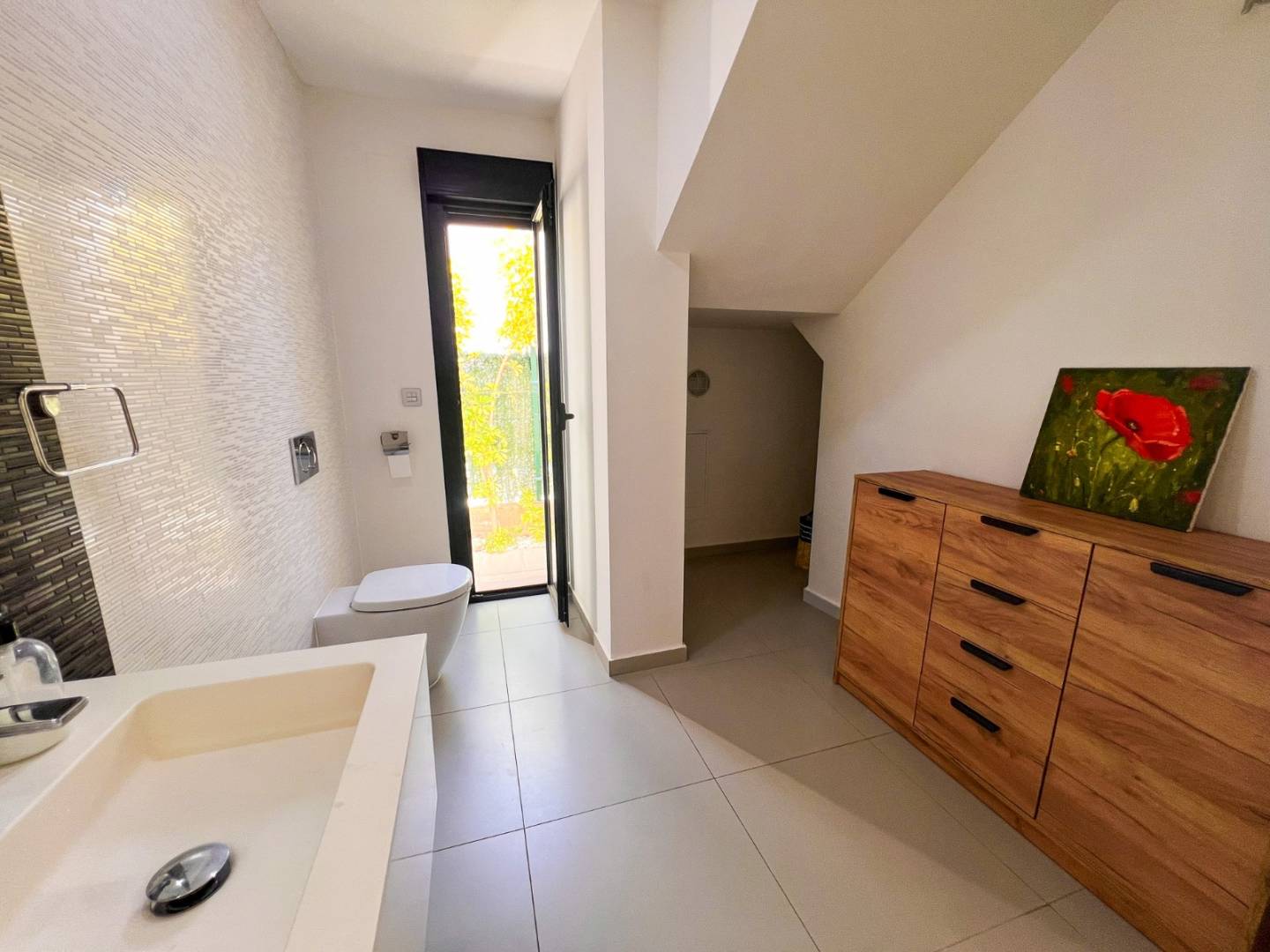 La distribución interior ha sido diseñada para maximizar la comodidad: dispone de 3 dormitorios, destacando el dormitorio principal en planta baja con baño en suite y vestidor, mientras que en la planta superior se encuentran dos dormitorios adicionales y un baño completo. En la planta principal también se ubica un aseo de cortesía, aportando funcionalidad adicional para el día a día y para recibir invitados.
