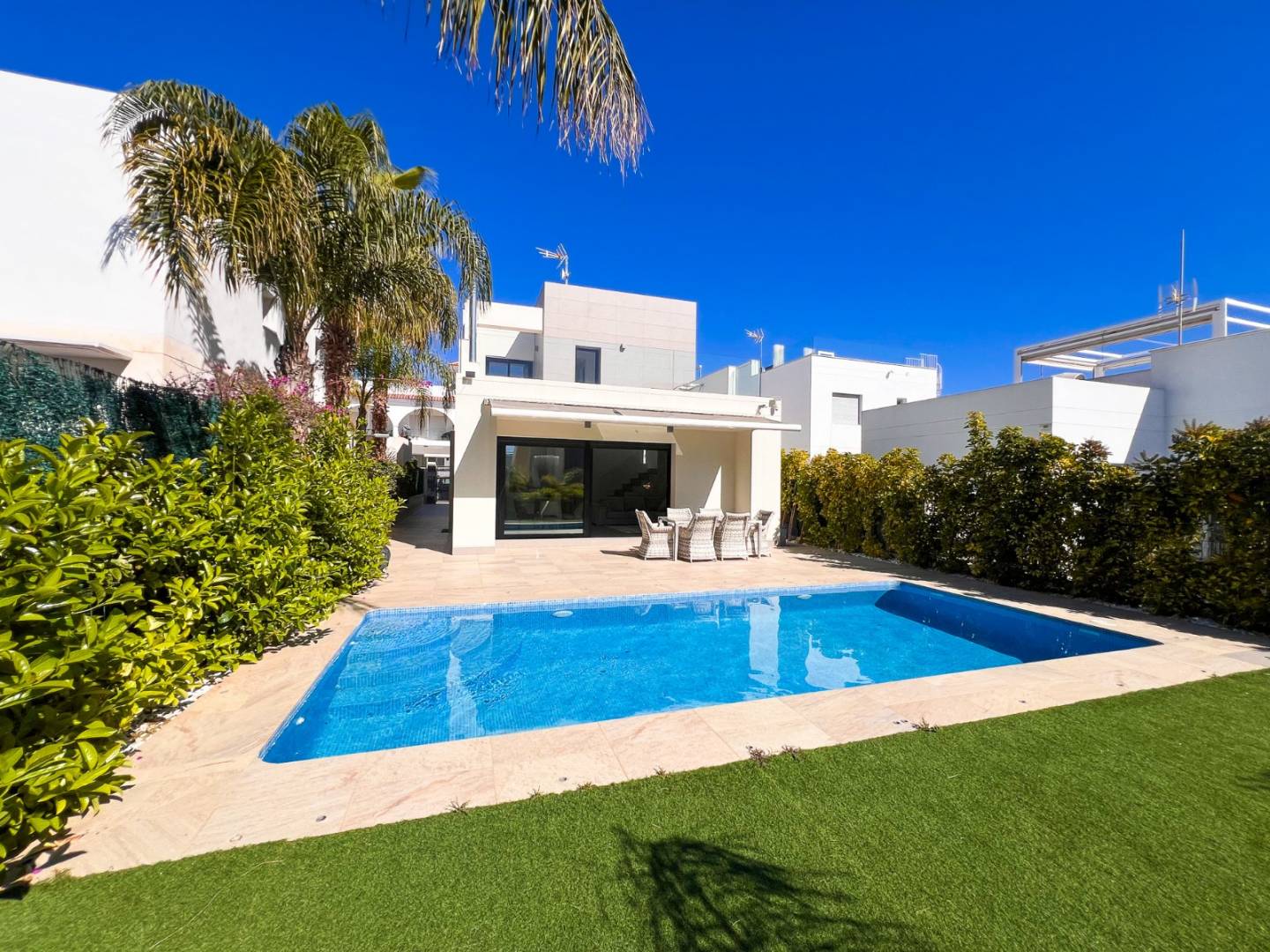 Descubra esta villa independiente de estilo contemporáneo, construida en 2014 y pensada para quienes valoran la privacidad, la luminosidad y el confort durante todo el año. Ubicada en Ciudad Quesada, a solo 7 km de las playas de Guardamar del Segura y a pocos minutos de todos los servicios, ofrece el equilibrio perfecto entre tranquilidad residencial y comodidad diaria. La propiedad se asienta sobre una parcela de 300 m² con un cuidado espacio exterior donde sobresale una piscina privada de 8 x 3,5 m, ideal para disfrutar del clima mediterráneo, además de zona de aparcamiento cubierta.