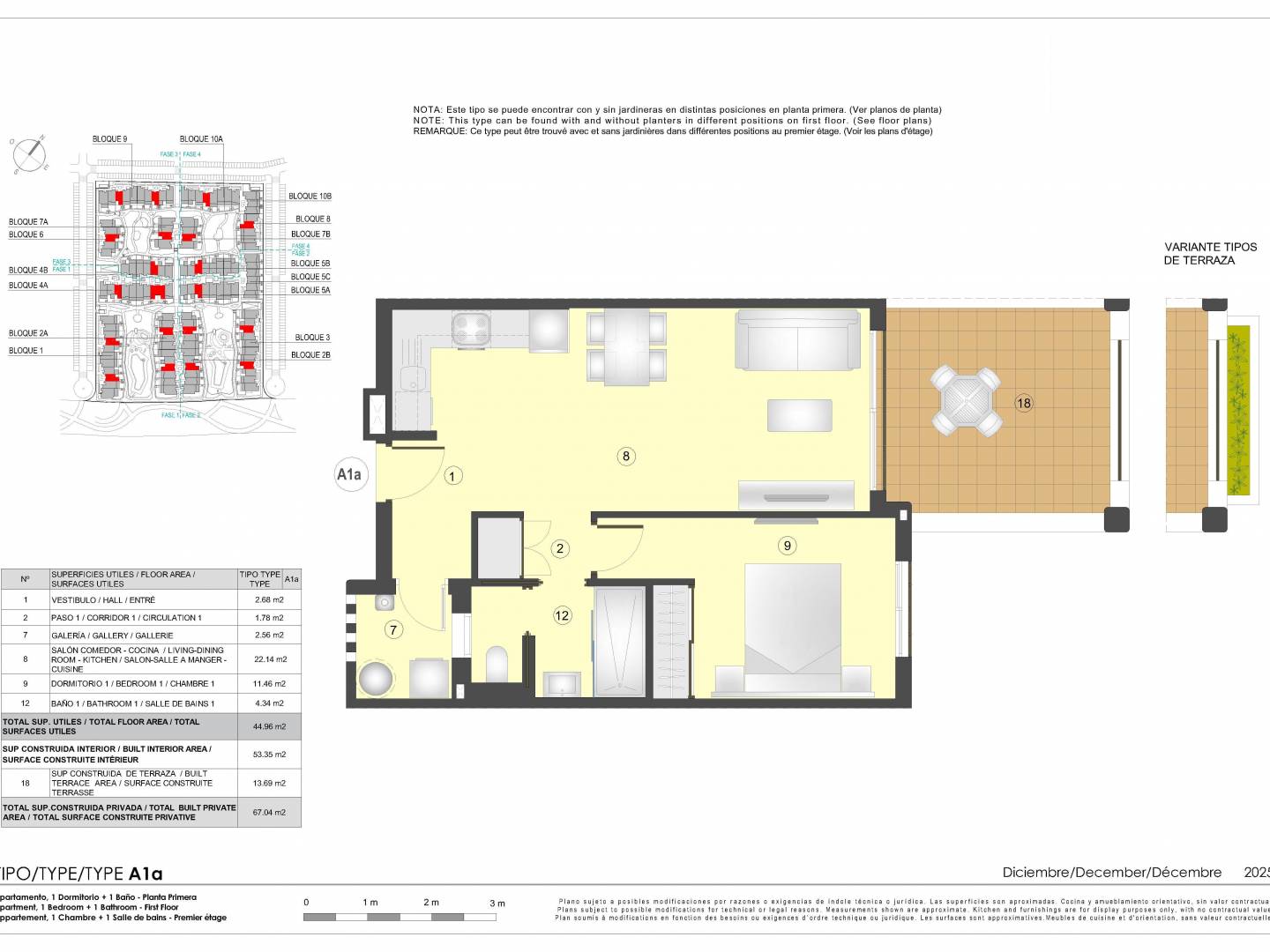 El interior de las viviendas está cuidadosamente diseñado para ofrecer confort y estilo. Los suelos de gres porcelánico aportan un toque moderno y son fáciles de mantener. Todas las propiedades están equipadas con armarios empotrados, optimizando el espacio de almacenamiento. La preinstalación de aire acondicionado asegura un ambiente agradable durante todo el año. Las opciones de distribución incluyen viviendas de 1, 2 y 3 dormitorios, con 1 o 2 baños, adaptándose a diferentes necesidades familiares.