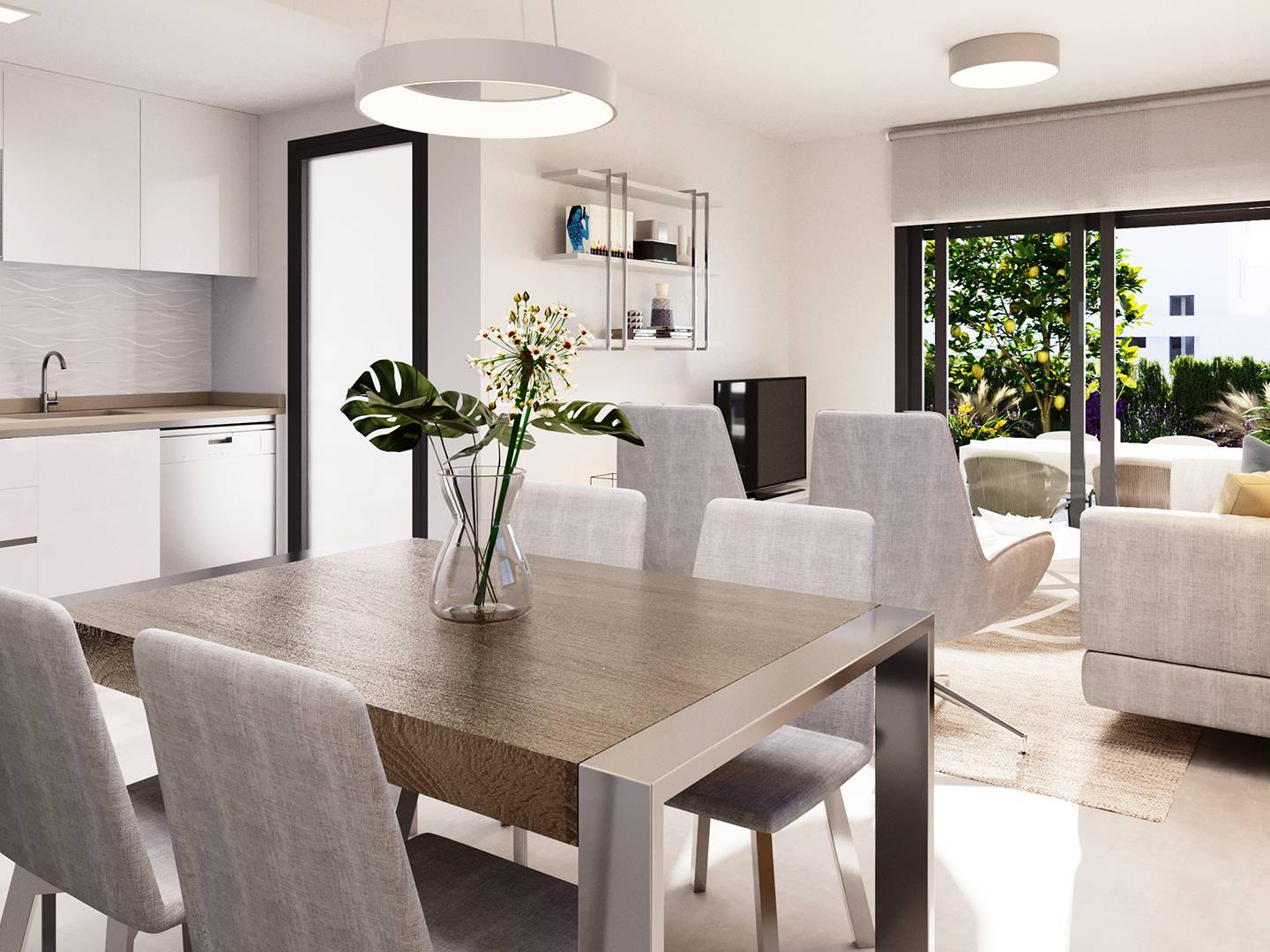 El interior de estas viviendas adosadas en Busot está diseñado para ofrecer un espacio acogedor y funcional. Los suelos de cerámica aportan un toque moderno y son fáciles de mantener, ideales para el ritmo de vida actual. La distribución de las viviendas permite una gran flexibilidad, con opciones de 2 o 3 dormitorios y 2 o 3 baños, adaptándose a las necesidades de cada familia. Los armarios empotrados proporcionan un almacenamiento eficiente, manteniendo los espacios ordenados y libres de desorden. La preinstalación de aire acondicionado asegura que el hogar se mantenga confortable durante todo el año, mientras que los electrodomésticos incluidos facilitan la vida diaria, permitiendo disfrutar de un hogar listo para habitar desde el primer día.