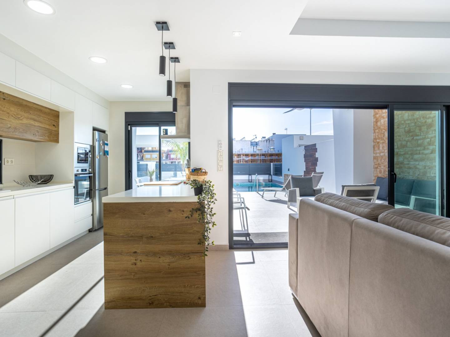 Descubra esta encantadora villa independiente de diseño, prácticamente nueva, que combina a la perfección diseño contemporáneo, eficiencia energética y alto potencial de inversión. Situada sobre una parcela privada de 238 m² y con una superficie construida de aproximadamente 150 m², esta propiedad ha sido concebida para maximizar la luz natural, la amplitud y la conexión entre espacios interiores y exteriores. Desde el primer momento, el elegante salón de concepto abierto impresiona por sus líneas modernas y grandes ventanales, integrándose con una cocina totalmente equipada con electrodomésticos de alta gama, ideal tanto para el día a día como para recibir invitados. La vivienda principal dispone de 3 amplios dormitorios, 2 baños modernos y un aseo de cortesía, todos diseñados con materiales de alta calidad y atención al detalle. Como valor añadido, el amplio sótano habitable incluye un dormitorio adicional y ofrece múltiples posibilidades como suite de invitados, gimnasio, sala de cine o despacho privado. En el exterior, la propiedad ofrece un auténtico oasis con una piscina privada de 6x3 metros, amplias zonas de terraza y un entorno de bajo mantenimiento, perfecto para disfrutar del estilo de vida mediterráneo con total privacidad. Además, cuenta con parking privado dentro de la parcela. Equipada con aire acondicionado centralizado, persianas eléctricas y 12 paneles solares, garantiza confort y eficiencia energética durante todo el año. Se vende completamente amueblada y dispone de licencia turística, lo que la convierte en una excelente oportunidad de inversión con alta rentabilidad o en una vivienda lista para entrar a vivir.