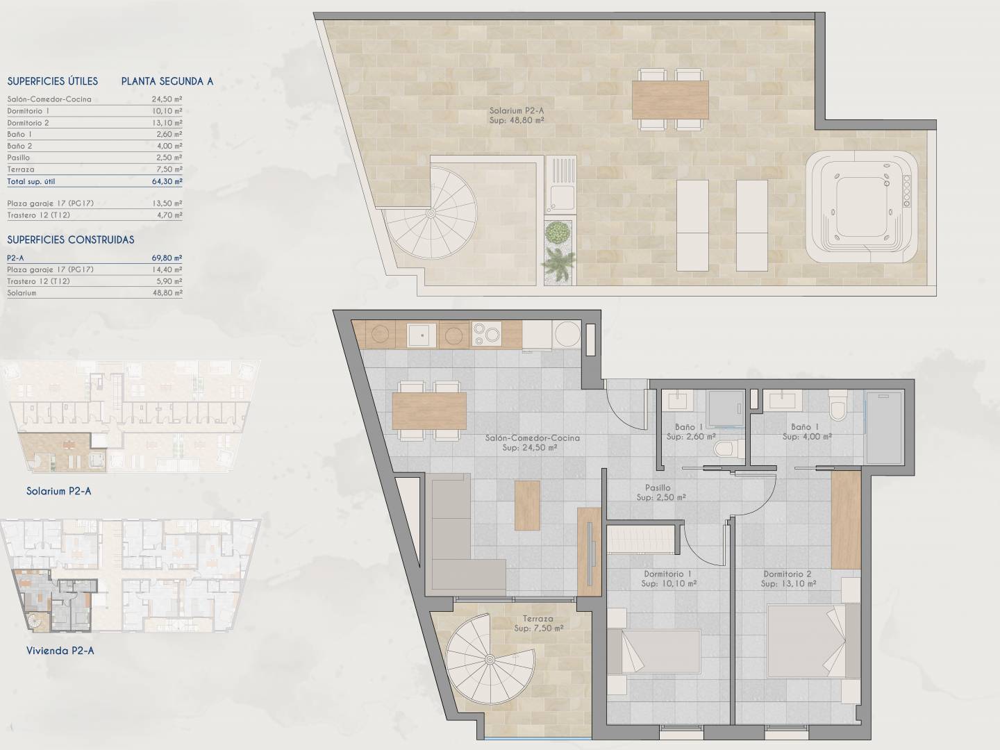Los exteriores de estas viviendas han sido cuidadosamente diseñados para ofrecer un espacio de relajación y disfrute al aire libre. Cada propiedad cuenta con una terraza privada, perfecta para disfrutar del clima mediterráneo. Además, algunas tipologías incluyen un solárium, proporcionando un espacio adicional para tomar el sol o disfrutar de las vistas panorámicas. La presencia de una pérgola añade un toque de elegancia y funcionalidad, permitiendo crear zonas de sombra para mayor confort. Para aquellos que buscan un toque de lujo, ciertas viviendas disponen de piscina privada y jacuzzi, ideales para relajarse en la intimidad del hogar.