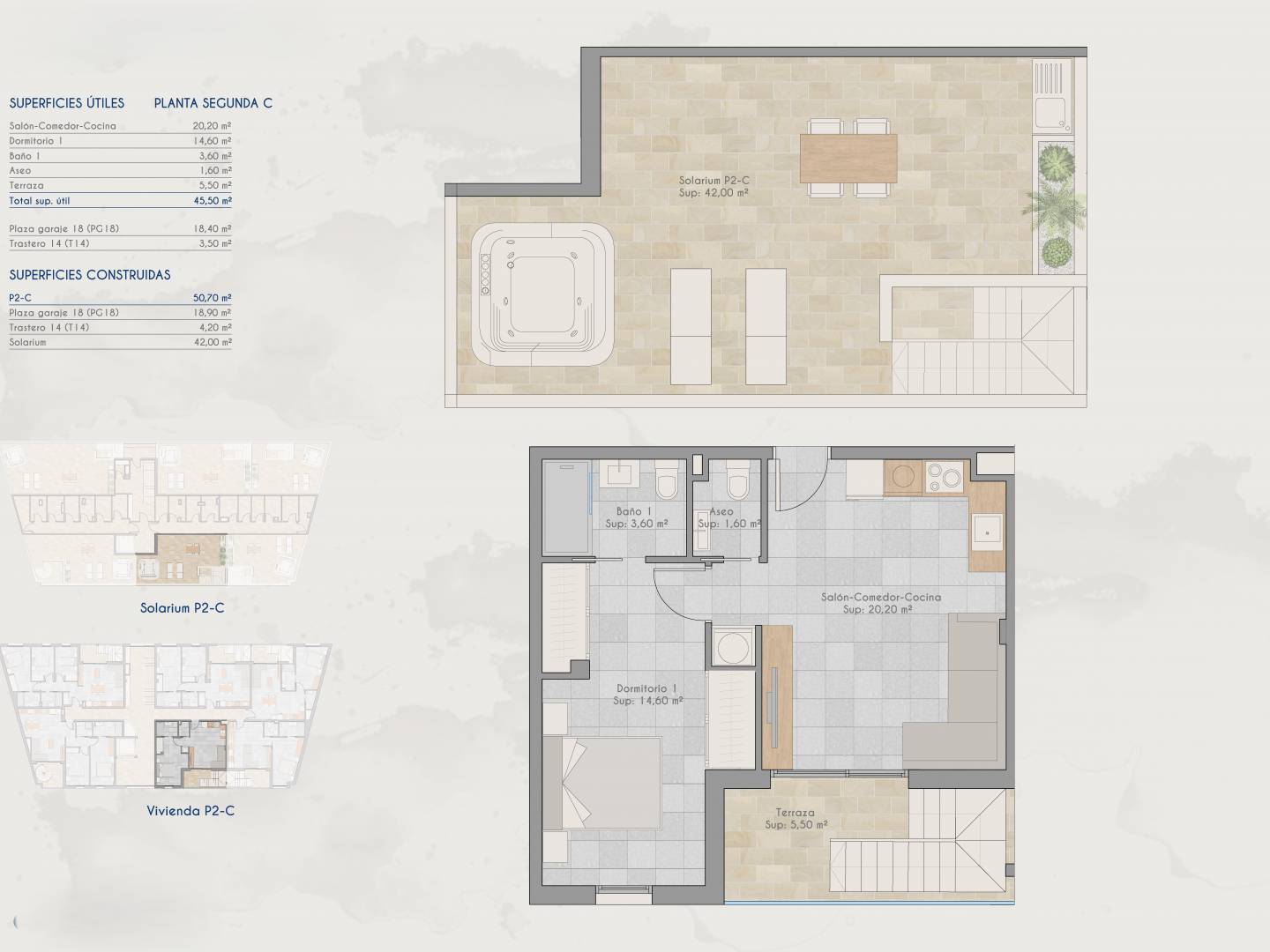 Los exteriores de estas viviendas han sido cuidadosamente diseñados para ofrecer un espacio de relajación y disfrute al aire libre. Cada propiedad cuenta con una terraza privada, perfecta para disfrutar del clima mediterráneo. Además, algunas tipologías incluyen un solárium, proporcionando un espacio adicional para tomar el sol o disfrutar de las vistas panorámicas. La presencia de una pérgola añade un toque de elegancia y funcionalidad, permitiendo crear zonas de sombra para mayor confort. Para aquellos que buscan un toque de lujo, ciertas viviendas disponen de piscina privada y jacuzzi, ideales para relajarse en la intimidad del hogar.